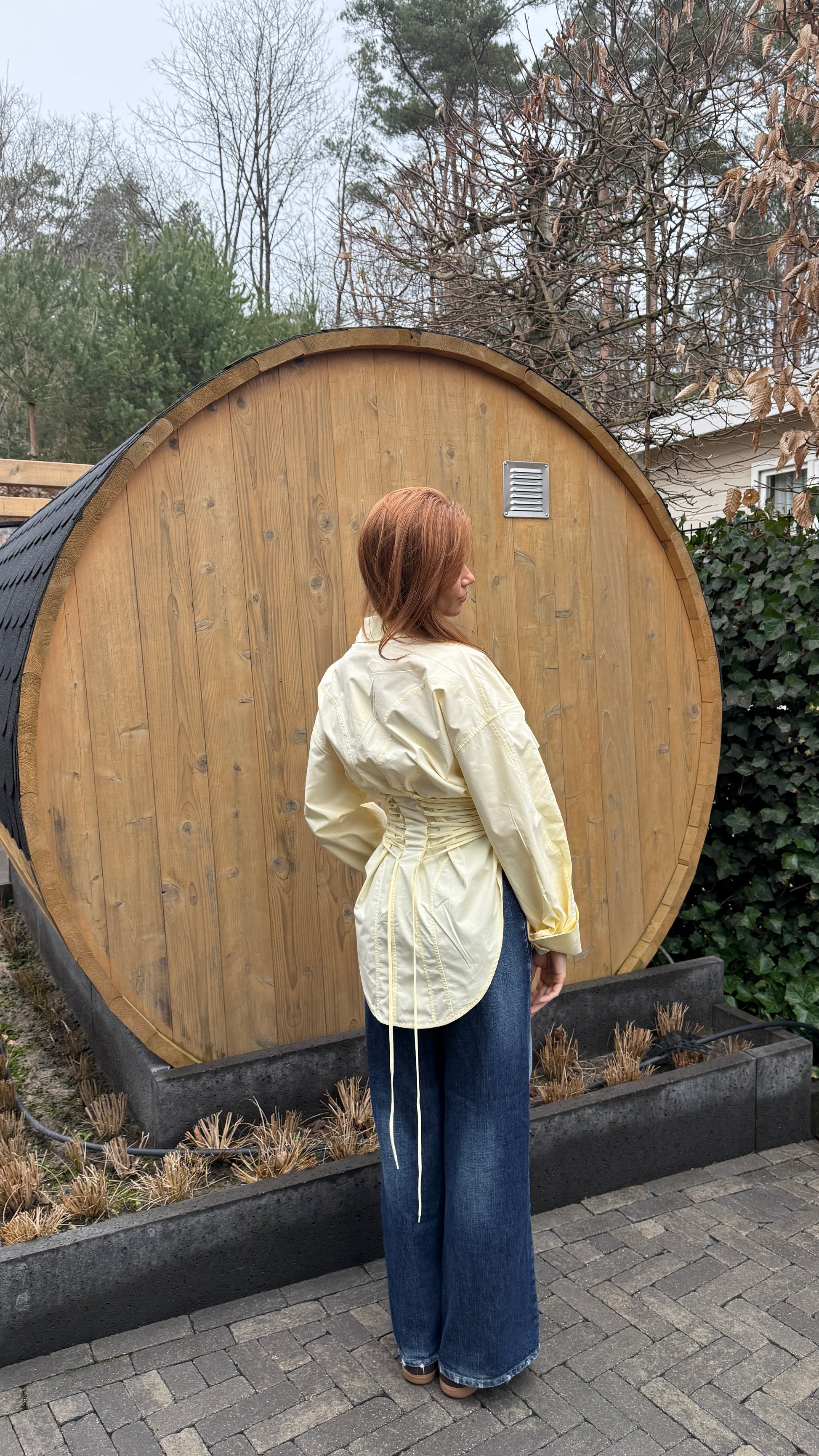 Een statement blouse met een vrouwelijke, gesculpteerde pasvorm. De taille-details creëren een subtiele corset look, terwijl de zachte lichtgele kleur zorgt voor een frisse, elegante uitstraling